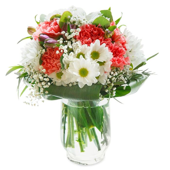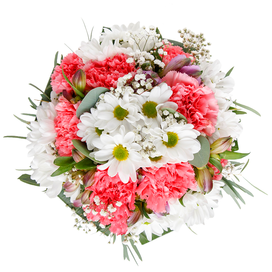 Enhance any occasion with our elegantly designed bouquet, featuring snow-white chrysanthemums, delicate gypsophila, and soft light pink carnations, all beautifully arranged with vibrant aspidistra leaves. This unique combination exudes sophistication and charm.